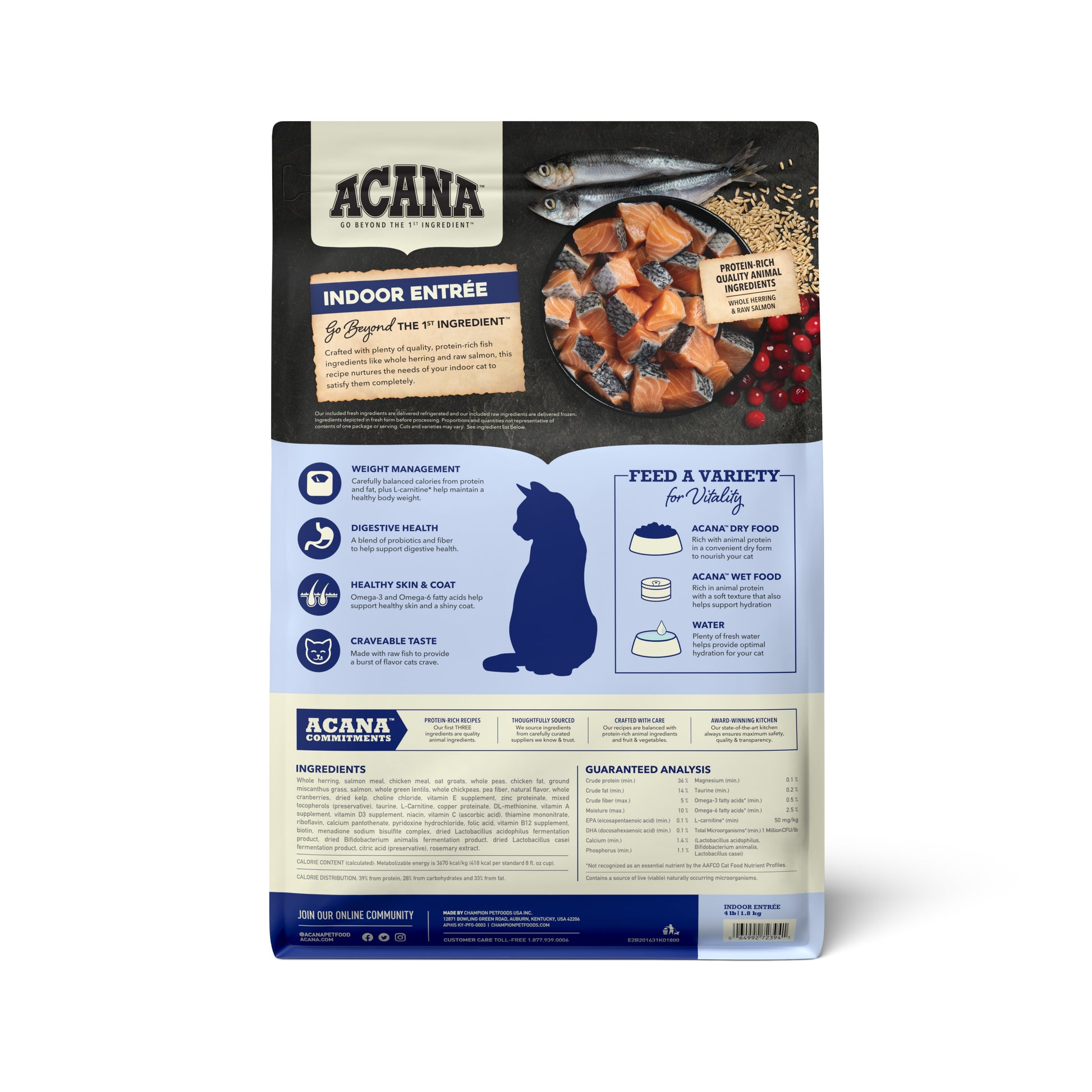 Nurture the needs of your indoor cat with ACANA™ Indoor Entrée recipe with fish. Uniquely crafted for the needs of indoor cats, this recipe is rich with 65% animal ingredients1 including delicious and nourishing whole herring and raw salmon, offering a burst of flavorful fish in every bite. It also includes 3 key health benefits that help support your indoor feline’s wellbeing, including weight management, digestive health, and healthy skin & coat. Help your indoor cat feel and look their best by feeding them ACANA Indoor Entrée recipe with fish!