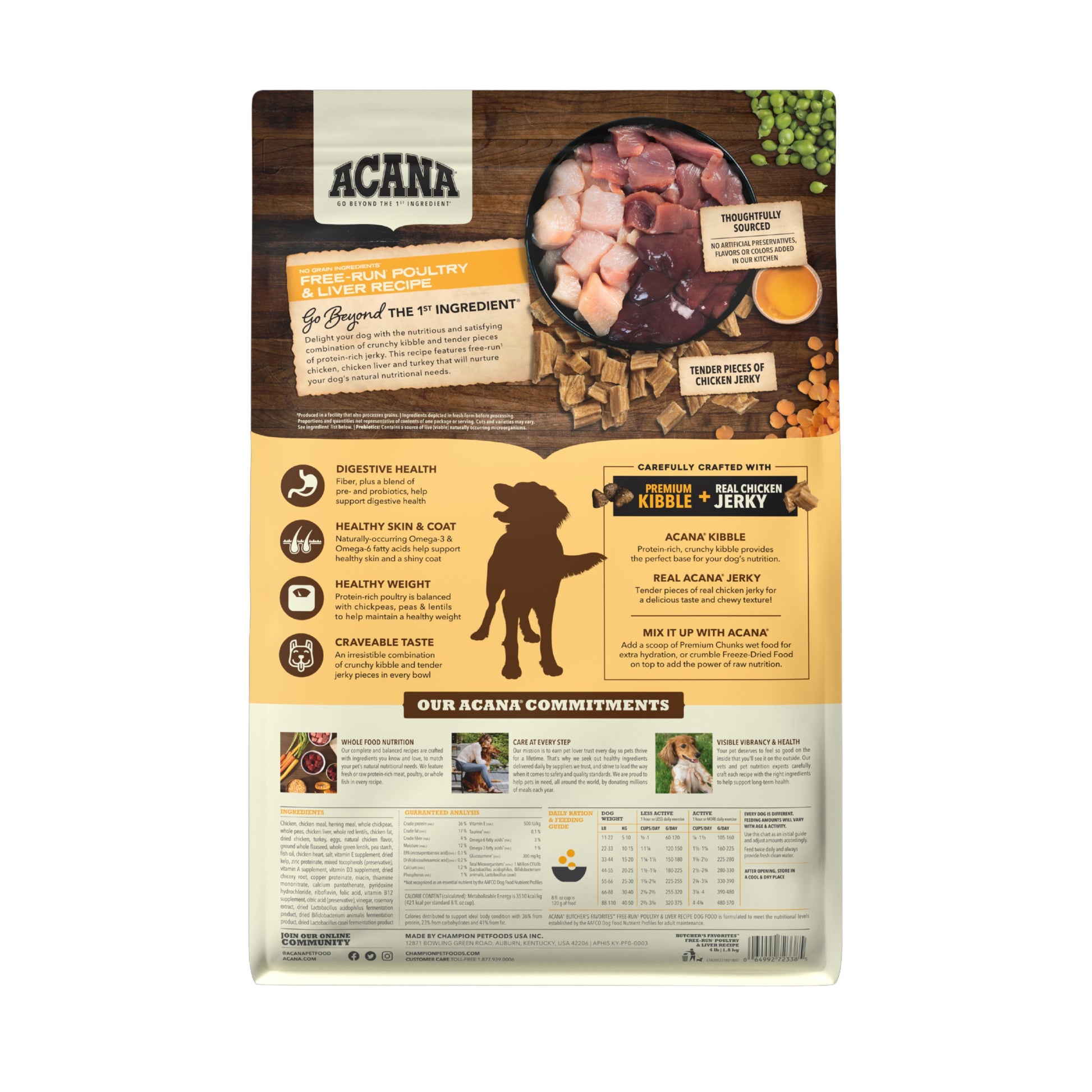 Delight your dog with the nutritious and satisfying combination of premium ACANA™ kibble and chewy pieces of protein-rich jerky! ACANA Butcher’s Favorites™ recipes are rich with fresh or raw chicken, turkey and cage-free eggs balanced with wholesome plant ingredients. And with tender pieces of chicken jerky, your dog will be craving every bite! Our nutritious ingredients also help support 3 key health benefits, including Digestive Health, Skin & Coat Health and Healthy Weight. Provide your dog with variety and enjoyment as they discover hearty, meaty flavor in every bite.