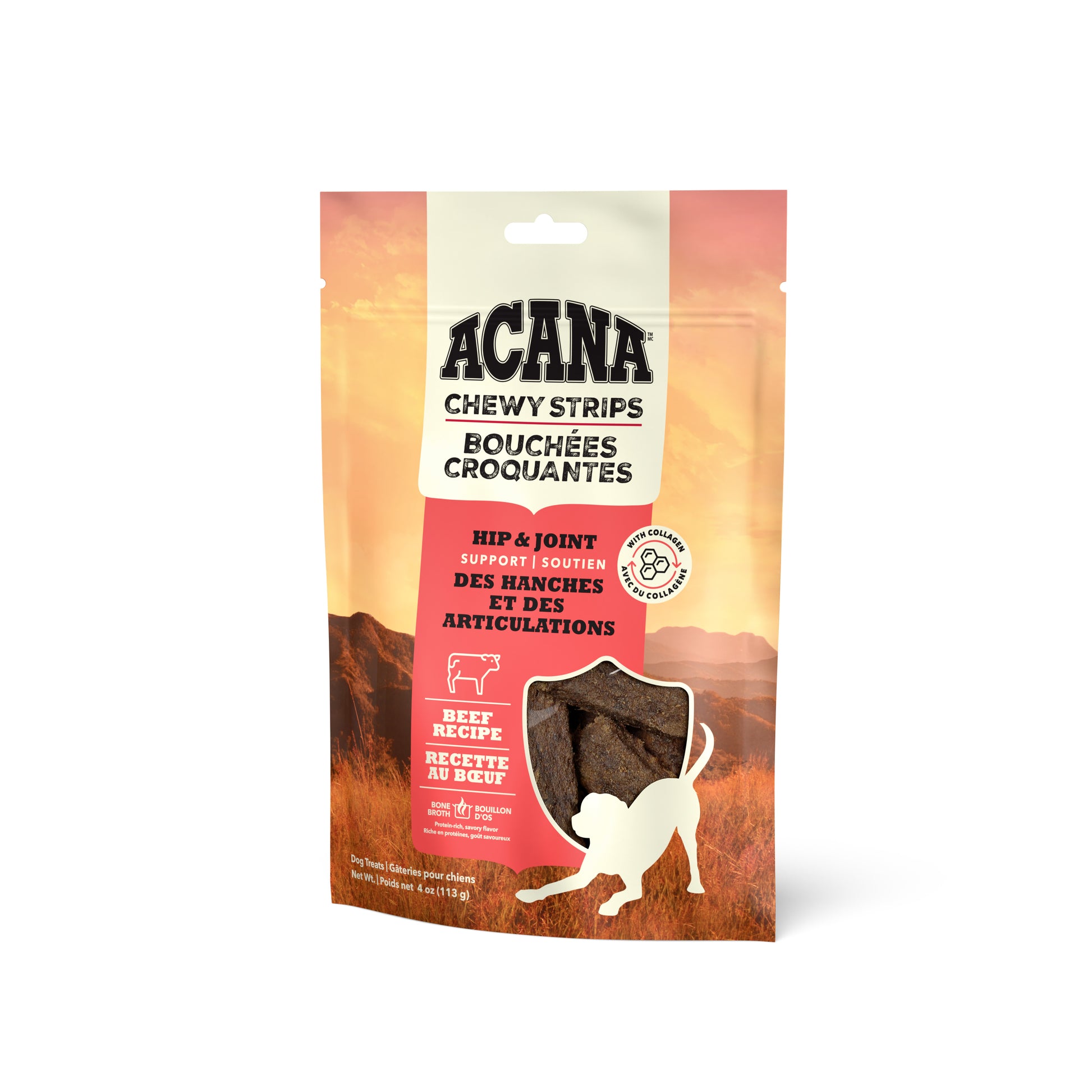 Delight your dog with the savory flavor of ACANA™ Chewy Strips! Crafted with 5 key ingredients, including delicious, protein-rich beef and superfood sweet potatoes, you can feel good about treating your dog. Every strip also helps support your dog’s hip & joint health with Omega-3 fatty acids from algal oil. Bone broth adds a burst of flavor, and sweet honey gives Chewy Strips a texture dogs love. It’s the perfect snack for moments you want to treat your dog while helping to support their wellbeing!