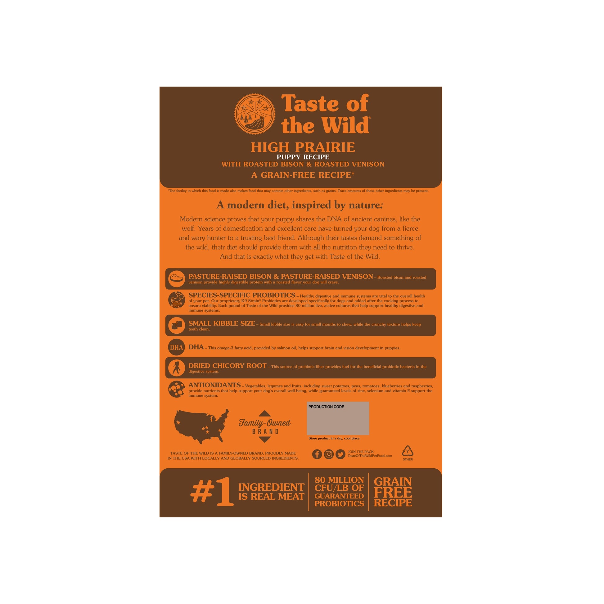 Roasted bison and roasted venison provide tasty, highly digestible energy for your growing puppy. Unique flavors from roasted meats, vegetables, legumes and fruits in a small kibble size make it easy for puppies to enjoy the nutrients they need for overall vitality. Because of the complete nutrition and guaranteed levels of DHA, this recipe is good for pregnant or nursing mothers and other adult dogs as well.