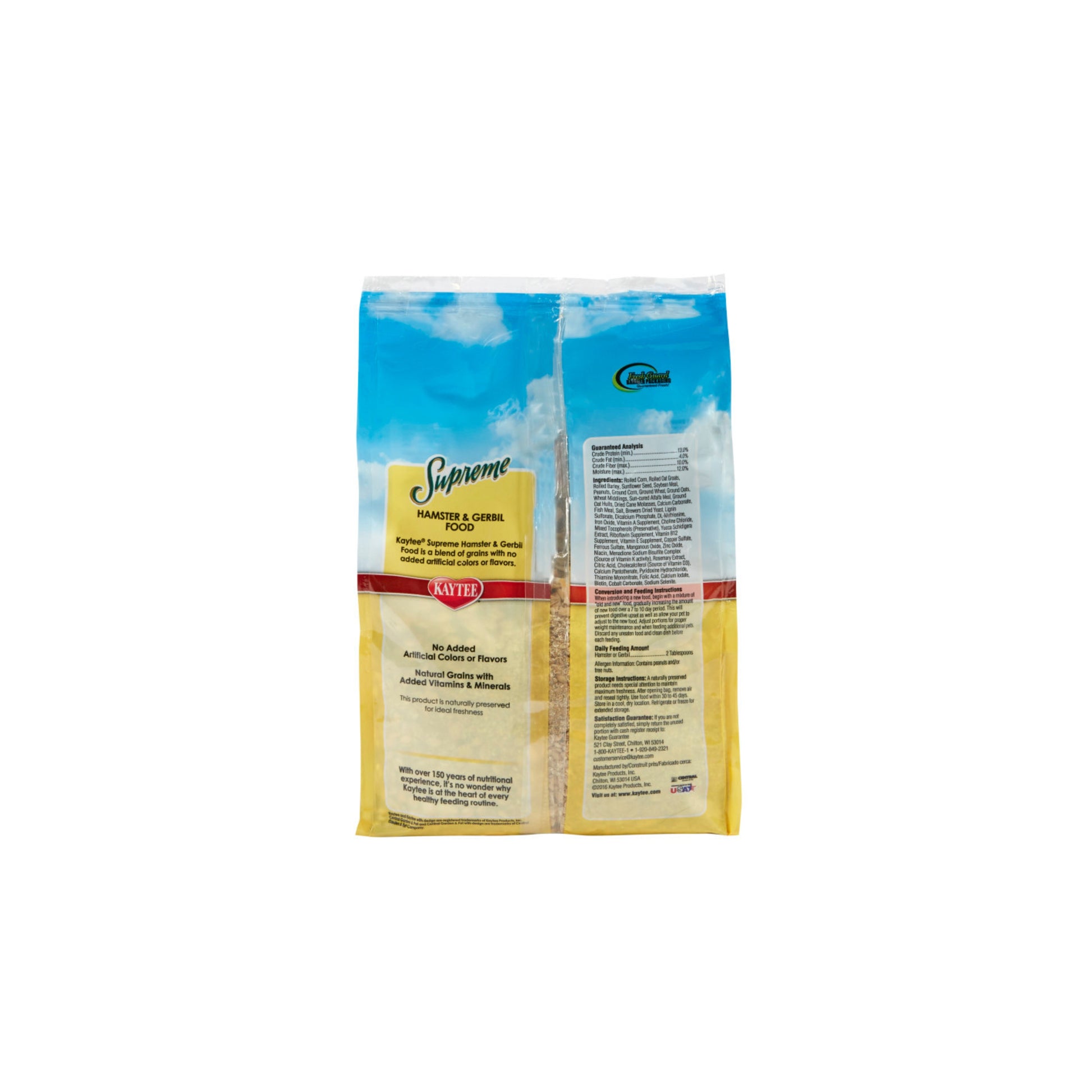 Kaytee Supreme Hamster and Gerbil food is a wholesome, high-quality mix that contains all of the natural protein, fiber, oils and nutrients of whole grains. Fortified to ensure a balance blend, Supreme utilizes natural seeds, grains and pellets to provide your small pet with a simple yet healthy diet. Kaytee Supreme offers high quality ingredients small animals love and the nutrition they require.