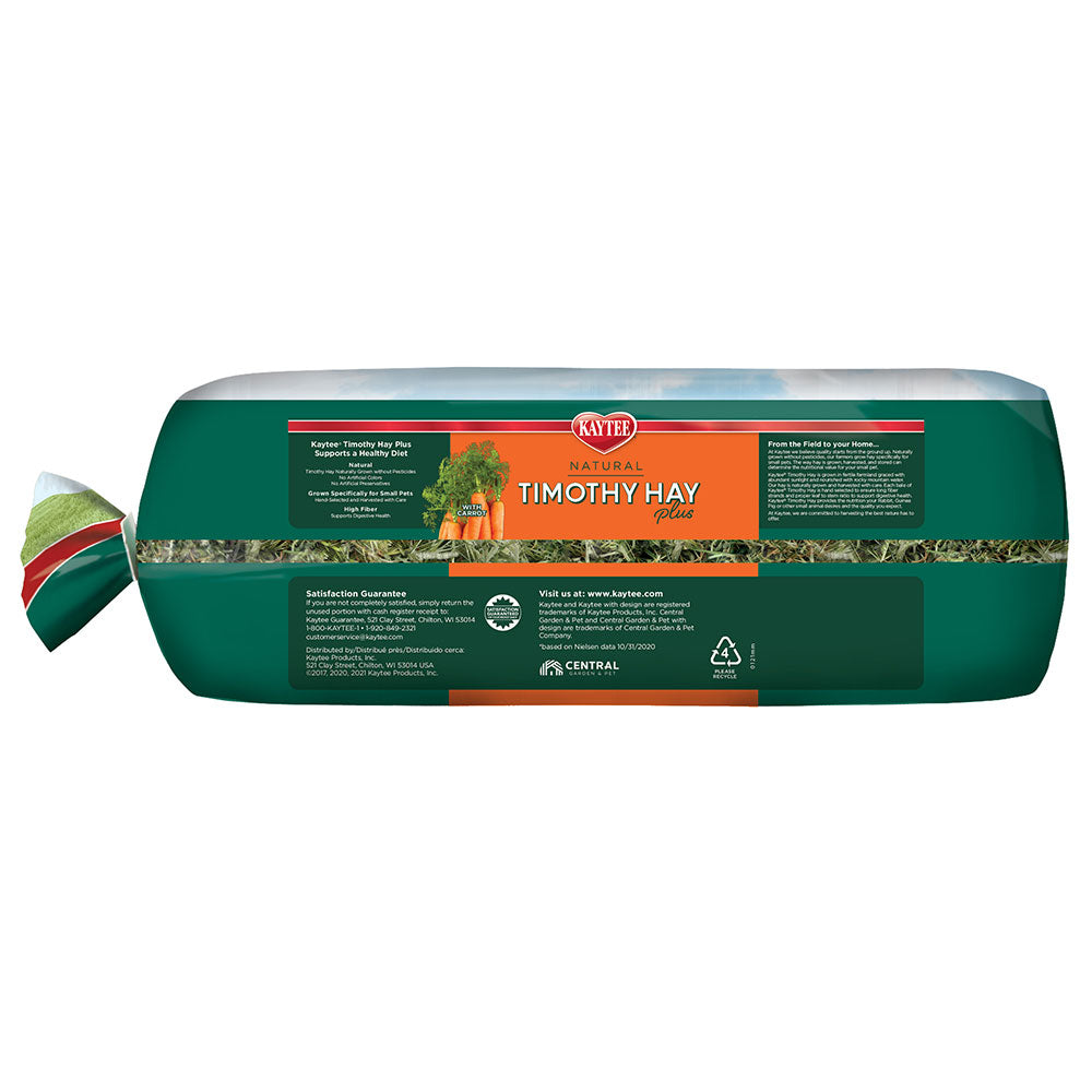 Kaytee Timothy Hay Plus Carrots combines the benefits of Timothy hay with the flavor and texture variety that complements any Kaytee fortified food. Timothy Hay is ideal for animals over 7 months of age because it is higher in fiber to support digestive health and lower in protein and calcium than alfalfa hay to support urinary health.