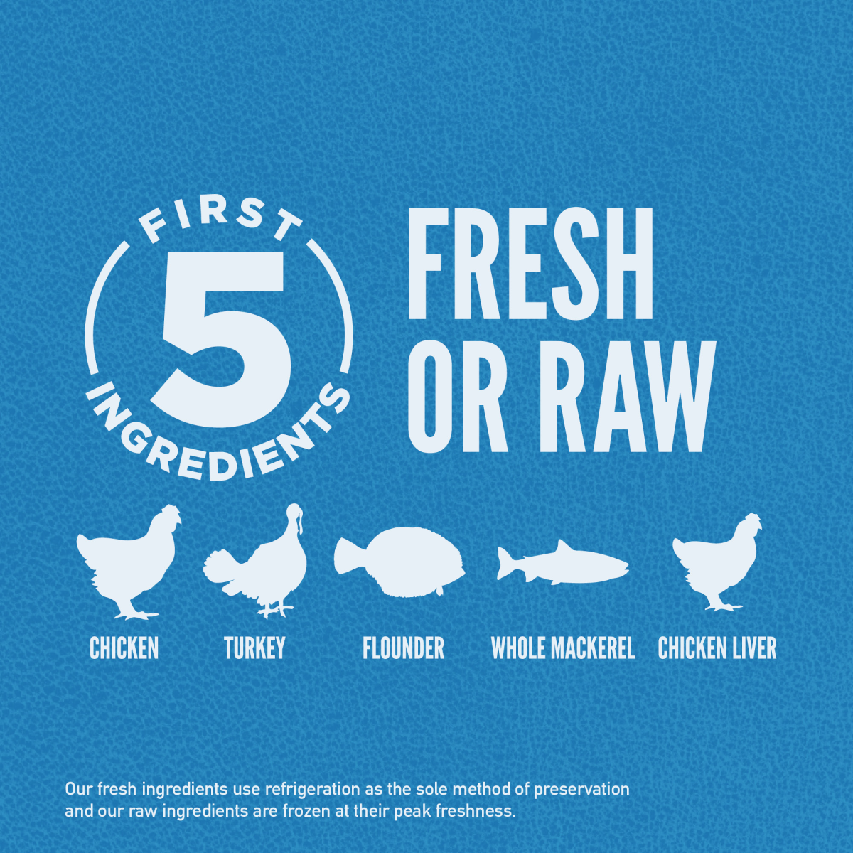 The first 5 ingredients are fresh or raw poultry and fish ingredients. Our fresh ingredients use refrigeration as the sole method of preservation and our raw ingredients are frozen at their peak freshness.