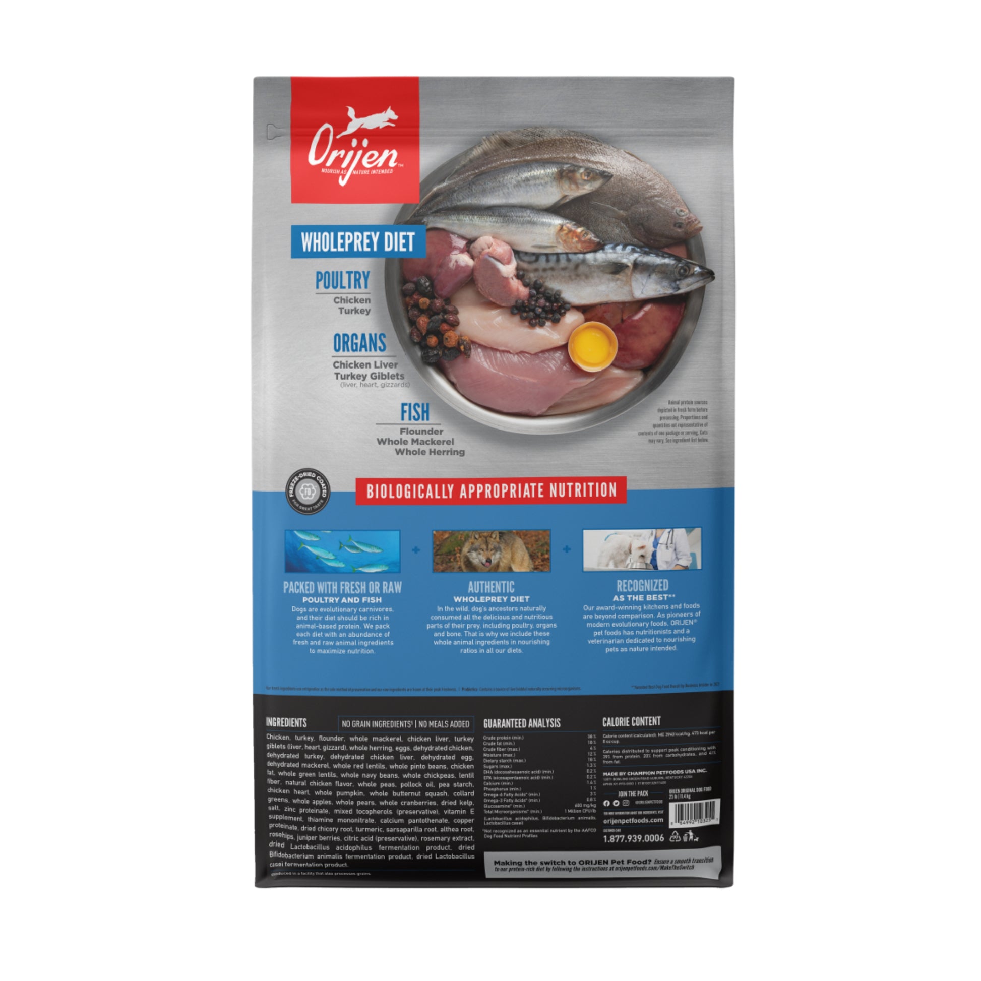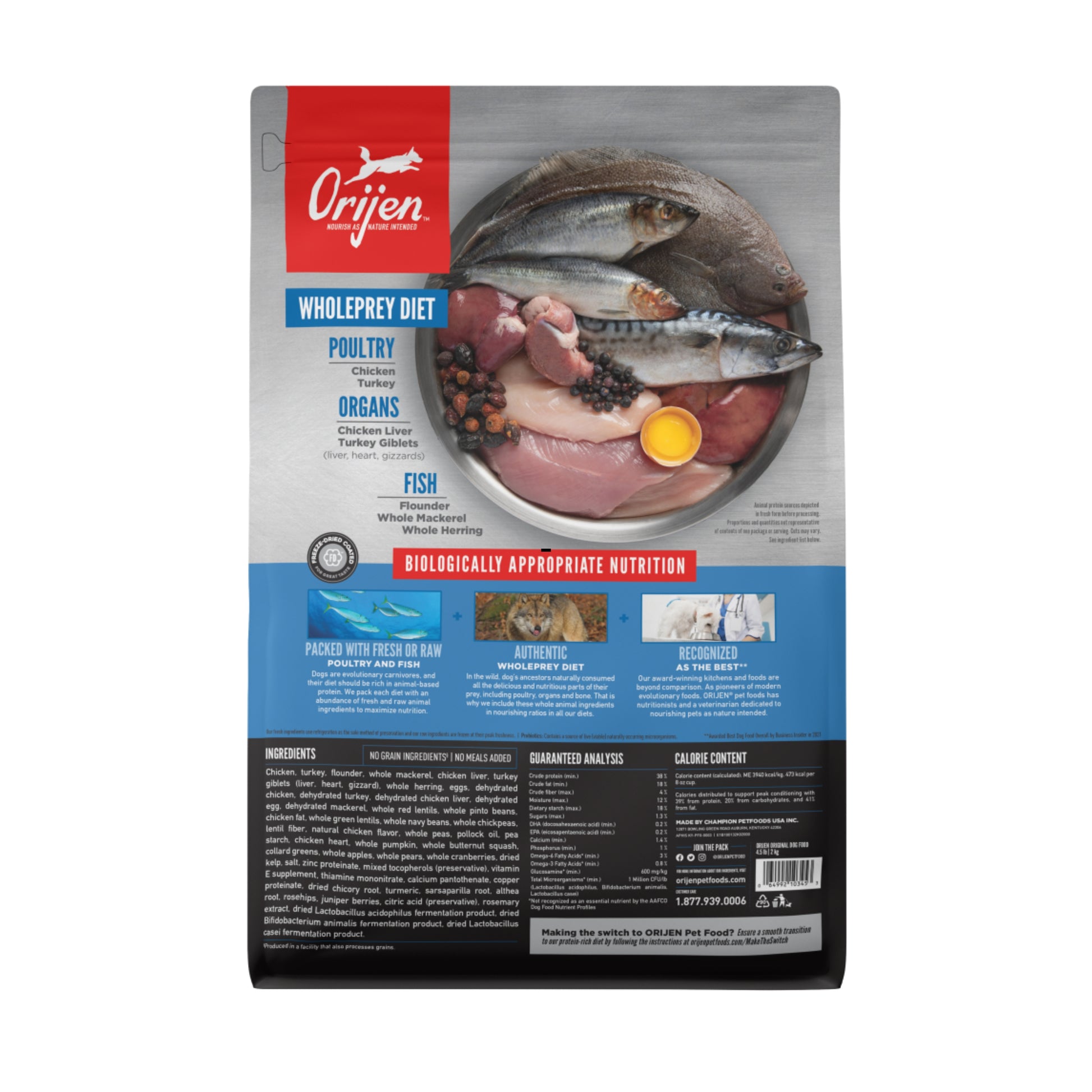 Help your dog thrive with the power of protein-rich recipes that provide peak nourishment. Dogs are ancestral carnivores, so they need a Biologically Appropriate diet packed with whole animal ingredients. ORIJEN® Original diet is crafted with 85%* quality animal ingredients like fresh or raw free-run** chicken and turkey and wild-caught fish. Packed with WholePrey animal ingredients like organs and bone, ORIJEN food is made with the most nutrient-dense, succulent parts of the prey to deliver the nutrition dogs need. The nourishing animal ingredients in ORIJEN Original diet help support your dog’s Immune Health, Skin & Coat Health and Digestive Health. The result is a diet for your canine companion that is beyond comparison.